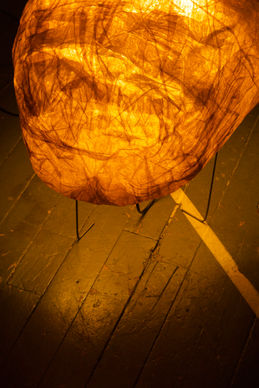 A lamp made from almost nothing: four music wires, recycled tissue paper, glue, water, and the hands.